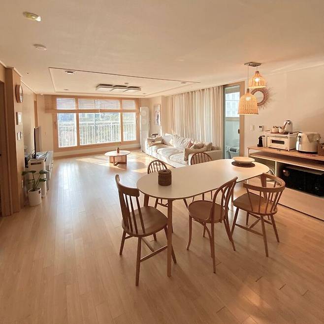 거실 콘셉트는 바닥과 몰딩이 우드톤이고 벽지가 화이트 컬러라 다른 가구나 소품들도 화이트 및 우드로 전체적인 색감을 맞추고 군데군데 라탄 제품들로 포인트를 줬어요. 이렇게 색감을 통일하니 편안하고 따뜻한 느낌이 나는 것 같아요.
