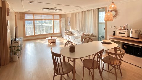 현관을 따라 들어오면 가장 먼저 보이는 모습인데요, 거실과 주방이 한 공간으로 이어진 구조라 그런지 비슷한 평수에 비해 넓어 보이는 장점이 있어요.