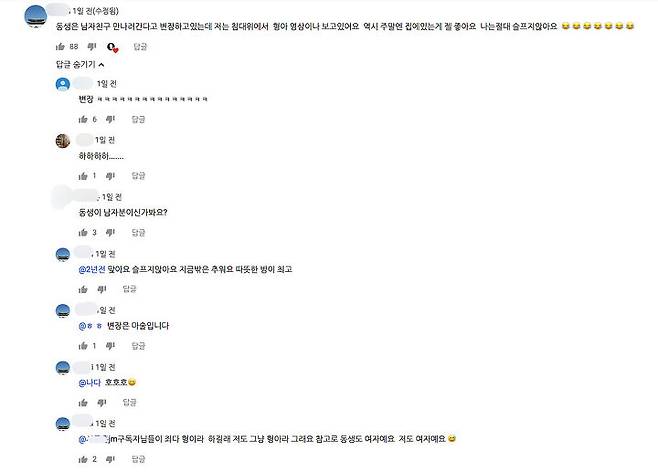 댓글 창에서는 재미있는 소통 현장을 목격할 수 있습니다. 잦은 방문과 댓글 남김에 유튜버도 알게 되는 댓글러가 생겨납니다.