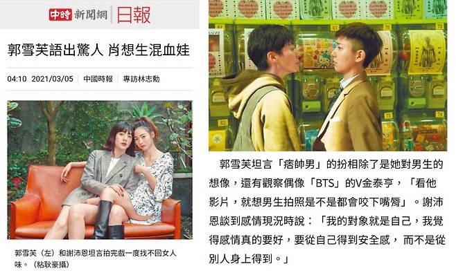 지난 5일 ‘중국시보’를 통해 배우 ‘곽설부’가 자신이 주연으로 출연해 개봉을 앞둔 영화 ‘게대환희’(揭大歡喜,As We Like It)에 관한 인터뷰에서 “‘잘 생긴 남자’의 등장은 방탄소년단 뷔, 김태형을 상상하게 한다”고 속마음을 내비쳐 눈길을 끌었다.