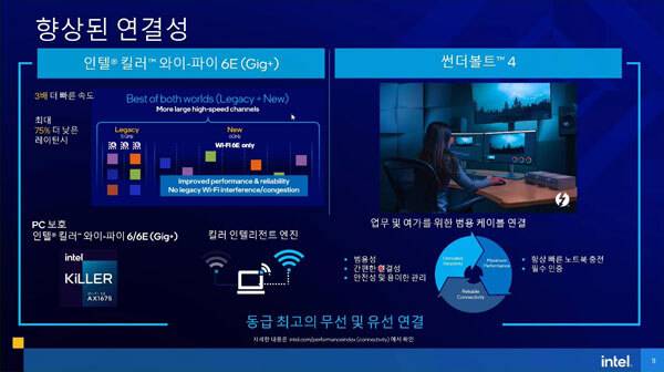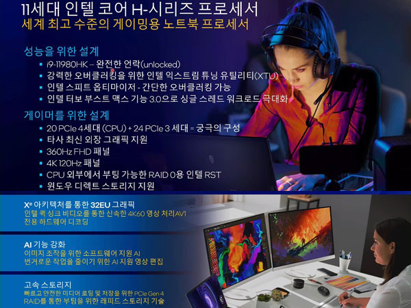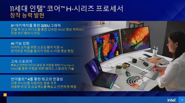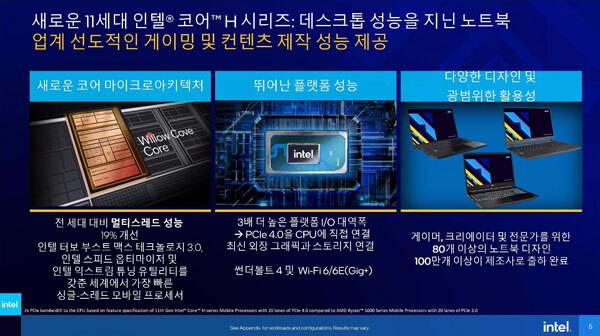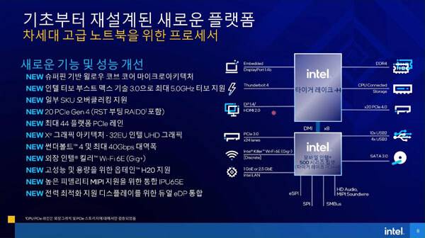 인텔은 노트북 제품 중 최초로 PCIe 4.0을 지원하는 타이거 레이크-H를 통해 4K HDR/돌비 비전 비디오 스트리밍 및 고속 스토리지가 포함된 다양한 구성이 가능하고, 고성능 및 용량을 위한 하이브리드 인텔 옵테인, 6GHz 인텔 킬러 와이파이 6E, 썬더볼트4를 통해 콘텐츠 크리에이터와 비즈니스 전문가에게 동급 최강의 구성요소와 연결성을 기반으로 어디서나 빠른 작업 환경을 제공할 것이라고 자신감을 나타냈다.