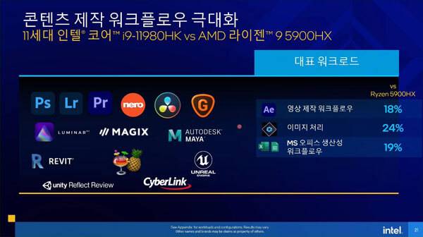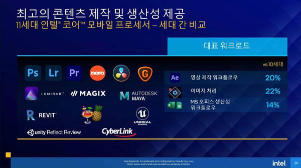 이에 따라 10세대 대비 영상 제작 워크플로우 20%, 이미지 처리 22%, 오피스 생산성 워크 플로우 14%의 성능 개선이 기대되며, 라이젠 9 5900HX와 비교했을 때는 각각 18%, 24%, 19% 빠른 성능 제공이 가능해진다.