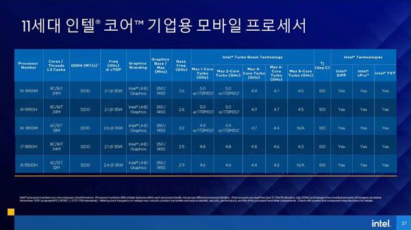 인텔은 또한 8코어 16스레드 인텔 코어 i9-11950H 프로세서를 중심으로 한 새로운 인텔 v프로 H 시리즈(Intel vPro H-series) 프로세서와 함께 인텔 제온 W-11000 시리즈 모바일 프로세서도 함께 공개했다.