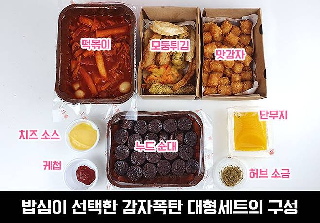 밥심은 1첩 떡볶이로는 감자폭탄 떡볶이 / 2첩 토핑으로는 모둠튀김 / 3첩 사이드로는 누드 순대를 선택했어요.