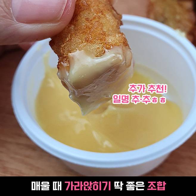 대신, 같이 온 치즈 소스를 찍어 먹으면 JMT으로 변신해요ㅋㅋ 떡볶이 먹다가 좀 매워졌다~ 싶을 때 찍어 먹으니까 환상궁합!