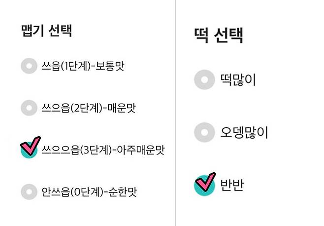 주문 시작부터 빵 터졌습니다ㅋㅋㅋ 맵기 선택 너무 귀여운 거 아니냐구요!! 밥심은 이날 매운 게 당겨 쓰으으읍맛 3단계로 선택했습니다. 좋았던 점은 엽떡처럼 떡, 어묵, 반반 중 선택할 수 있다는 것!