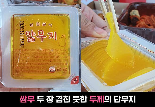 삼첩분식 단무지는 얇무지라는 이름으로 왔는데요. 이름에 걸맞게 쌈무 같은 느낌의 단무지였어요. 두께가 얇아서 반으로 베어먹지 않고 한입에 다 넣기 딱 좋았어요ㅎㅎ