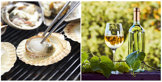 조개구이 하면 소주가 가장 먼저 떠오르지만, 알고 보면 화이트 와인과 환상의 케미를 자랑한다. 사실 화이트 와인은 이미 알려져 있듯 생선이나 해산물 요리와 잘 어울려 페어링해 먹는 경우가 많다. 봉골레 파스타를 만들 때에도 맛과 풍미를 살리기 위해 화이트 와인을 사용한다. 화이트 와인은 청포도의 신선함이 좋고, 신맛이 강해 식욕을 돋우어 준다. 또한, 맛이 가볍고 청량하기 때문에 조개구이 특유의 비릿한 맛을 상큼한 화이트 와인이 깔끔하게 잡아준다.