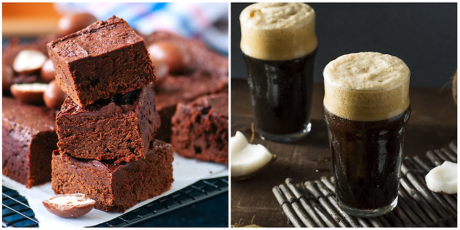 브라우니와 흑맥주의 만남은 예상외로 훌륭하다. 흑맥주 특유의 쌉싸름한 맛을 브라우니의 달콤함이 잡아주면서 뒤끝이 깔끔하다. 두 음식은 조합만으로도 훌륭하지만, 브라우니를 만들 때 함께 사용하면 궁극의 조합의 자랑한다. 브라우니에 흑맥주를 넣어 만들면 흑맥주의 씁쓸한 맛은 중화되고 단맛을 잡아 주면서 촉촉하니 훨씬 더 깊고 진한 브라우니를 맛볼 수 있다. 구우면서 알코올 성분은 날아가기 때문에 남녀노소 누구나 즐길 수 있다.