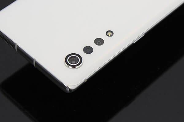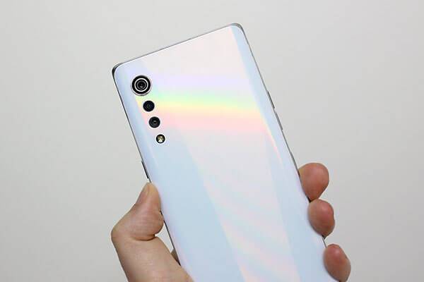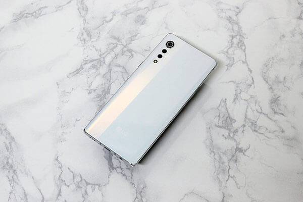 LG 벨벳의 후면은 기본적으로 빛의 각도에 따라 색상이 다르게 보이는 오로라 컬러를 채택하고 있다. 오로라 화이트에서 특히 이 색의 변화를 확인하기 쉬운데, 마치 무지개와 같은 색상이 살짝 나타난다.