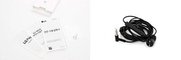 두 개의 작은 상자 중 납작한 상자 안에는 사용 설명서와 데이터 이동법, 그리고 LG페이 사용법이 적힌 프린트물과 유심 트레이 추출핀이 들어있으며, 다른 하나의 상자에는 번들 이어폰이 들어있다.