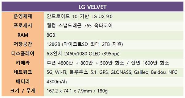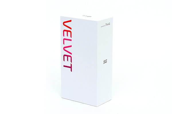 LG 벨벳은 많은 점이 달라졌다. 패키지부터 변화를 읽을 수 있는데, 꽤나 오랫동안 유지해오던 무광 검정 패키지를 버리고 완전히 반대인 화이트 박스를 채택했다. 박스 앞면에는 VELVET 브랜드명이 붉은톤으로 인쇄되어 있고, 한동안 자사 프리미엄 스마트폰에 붙이던 ThinQ는 명칭에서는 삭제되고 박스 측면에 ‘Powered by ThinQ’라는 설명으로 남아있다.