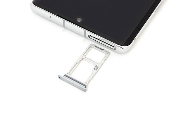 LG 벨벳은 메탈 프레임을 채택했다. 메탈 특유의 광택 재질 그대로를 드러내고 있는 프레임의 윗면에는 두 개의 절연선이 있고, 유심 트레이와 마이크 구멍이 하나 보인다. 유심 트레이는 나노 유심 하나와 마이크로 SD 하나를 동시에 장착할 수 있는 구조로 되어있다. 마이크로 SD 대신 두 번째 유심도 장착할 수 있는 타입이지만 국내 출시 모델에서는 듀얼 유심을 지원하지 않는다.