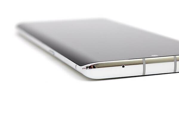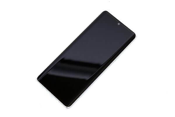 LG 벨벳의 전면부를 보면 지금까지의 LG 스마트폰과는 뭔가 확실히 다른 느낌이 든다. 이전 모델들에 비하면 세로로 좀 더 긴 느낌이고, 좌우 가장자리의 곡면이 더욱 넓어졌다. 전면 카메라는 여전히 가운데에 자리잡고 있으며, 물방울 노치 또한 그대로이다.