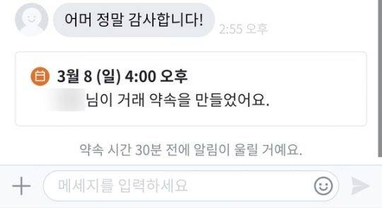 그래서 직거래를 선호하는 편인데, 그동안은 거래 일정 및 장소를 정한 뒤 각자가 이를 기억해야 했습니다. 약속을 정한 뒤 약속 하루 전 또는 몇 시간 전에 상대방에게 리마인드를 해드려야 했습니다. 이 또한 중고거래를 위한 ‘당연한’ 절차인 줄 알았습니다.