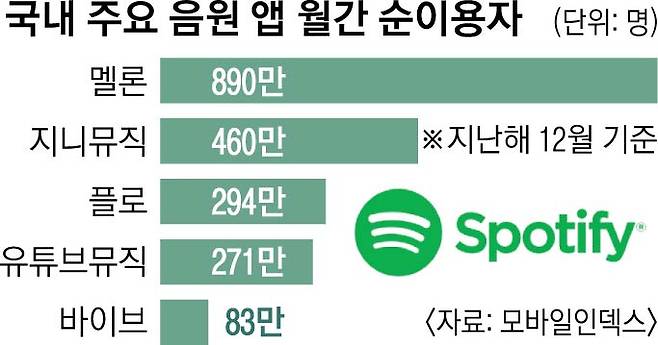 현재 국내 음원 시장은 '토종 업체'인 멜론, 지니뮤직, 플로가 이용자 수 1~3위를 차지하고 있는데 스포티파이가 판을 뒤흔들까 봐 경계하는 것이다.