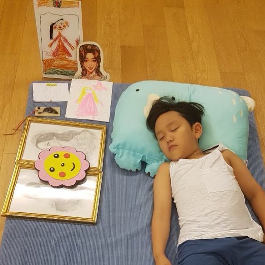 사진 속 주안 군은 엄마가 그려진 액자들 옆에 누워 곤히 잠든 모습입니다.