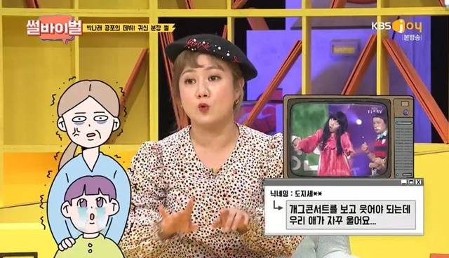 박나래는 “2달 했는데 ‘개그콘서트’ 보고 애가 웃어야 하는데 애가 운다고. 그래서 그걸 내렸다”며 시청자들의 무섭다는 의견 때문에 내렸다고 털어놨다. 김지민은 “재미있었는데”라며 아쉬워 했다. (사진= KBS Joy ‘썰바이벌’ 캡처)