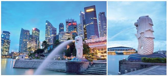 입에서 물을 내뿜는 멀라이언과 그 뒤편의 마천루가 어우러지는 풍경을 볼 수 있는 해상공원. 멀라이언(Merlion)은 인어(Mermaid)와 사자(Lion)의 합성어로 상반신은 사자, 하반신은 물고기 몸으로 되어 있어요.