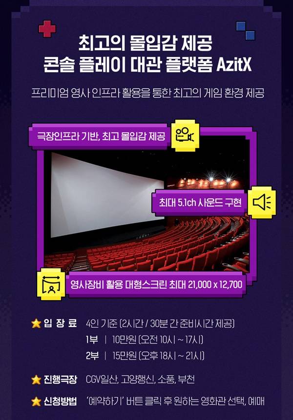 CGV는 8일 프리미엄 영사 인프라 활용을 통해 최고의 게임 환경을 제공하는 콘솔 플레이 대관 플랫폼 '아지트엑스(AzitX)'를 시작한다고 밝혔다.