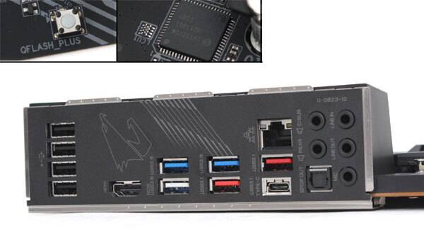 추가로, 백패널의 흰색 USB 3.0 포트에 바이오스 롬파일(gigabyte.bin)을 담은 USB 드라이브를 연결한 상태에서 메모리 슬롯에 인접한 고셍 위치한 QFLASH Plus 버튼을 누르면, 메인보드에 전원만 연결된 상태에서도 바이옷 업데이트가 진행된다.