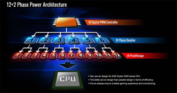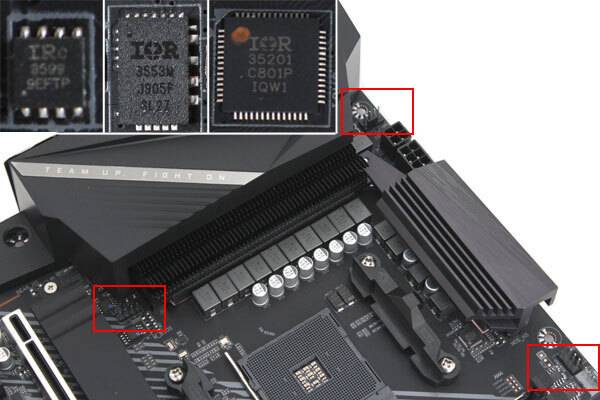 기가바이트 X570 어로스 프로 제이씨현 메인보드는 최대 16코어 기반의 3세대 라이젠 지원을 위해 총 12+2페이즈 구성의 전원부, 전원부 발열 대응을 위해 히트파이프와 결합된 방열판이 채택되었다.