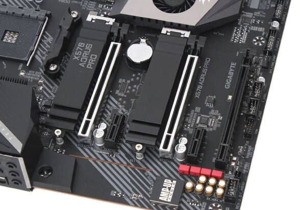기가바이트 X570 어로스 프로 제이씨현 메인보드는 CPU와 직접 연결된 PCIe 4.0 x4Lane M.2 소켓과 X570 칩셋과 연결된 PCIe 4.0 x4Lane M.2 소켓이 기본 제공된다. 이들 M.2 소켓은 PCIe NVMe 규격과 SATA 규격을 동시 지원하며, 최소 2242부터 최대 22110 폼펙터까지 지원한다.