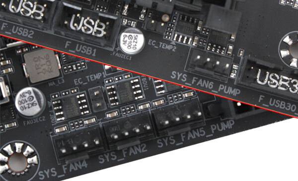 특히 백패널쪽 방열판은 타워형 CPU 쿨러에서 흔히볼 수 있는 핀형(두께 1.5mm) 방열판을 촘촘히 배치해, 하나의 덩어리 형태인 일반 방열판에 비해 더욱 방열면적을 넓혔으며, CPU 쿨링팬과 수랭 솔루션의 워터 펌프 대응, 일반 케이스 팬용 4핀 커넥터 1개로, CPU 및 전원부 발열 제어를 위해 CPU 소켓 주변으로만 총 3개의 쿨링팬 헤더가 구성되어 있다.