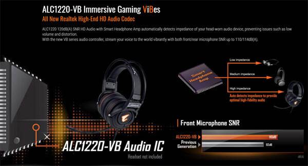 한편, 기가바이트 X570 어로스 프로 제이씨현 메인보드의 오디오 시스템은 ALC1220-VB 코덱을 기반으로 디자인되었다. 하이엔드 WIMA FKP2 캐퍼시터와 하이엔드 케미콘 오디오 캐퍼시터가 쓰였다.