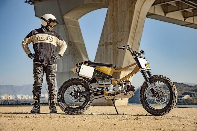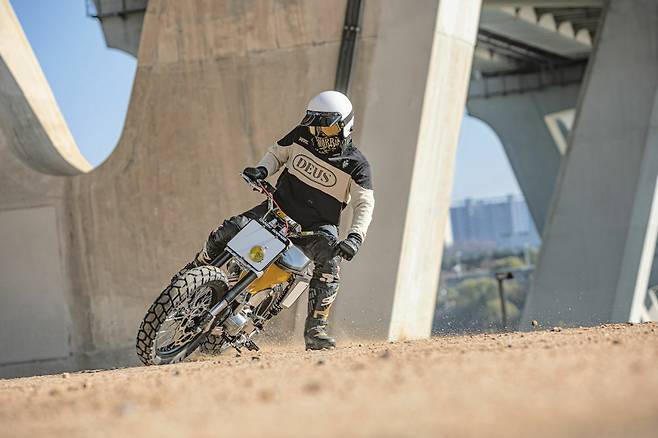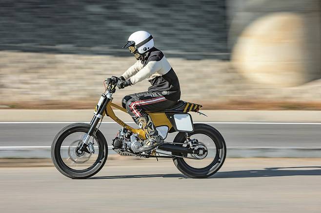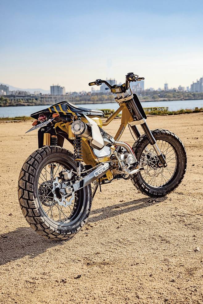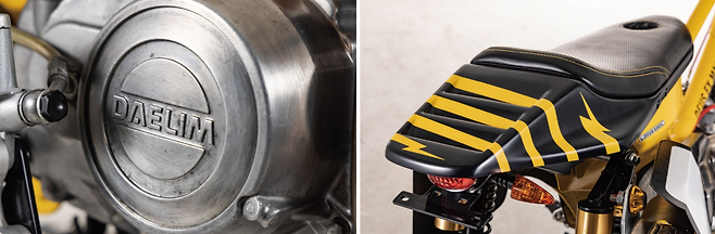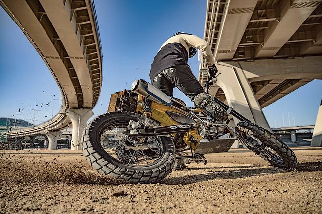보다시피 더 이상 배달의 기수였던 시티백의 모습을 떠올리기란 쉽지 않다. 높게 올라온 오프로드 스타일의 핸들 바부터 블록 패턴의 타이어와 스포크 휠, 납작하게 눌린 시트와 재킨넘버 플레이트 등이 영락없는 플랫트랙 레이스머신이다. 그런데 차체 아래 붙은 작은 엔진과 대림이란 각인을 보고 실없는 웃음이 터졌다. 우리에게 익숙한 시티백의 외장 페어링을 대부분 덜어내고 차대에 산뜻한 머스터드 컬러를 입혔다. 보조 프레임을 위쪽에 덧대 차체의 강성을 보강하고 오프로드 스타일의 휠 타이어와 길어진 서스펜션으로 차고를 높였다.