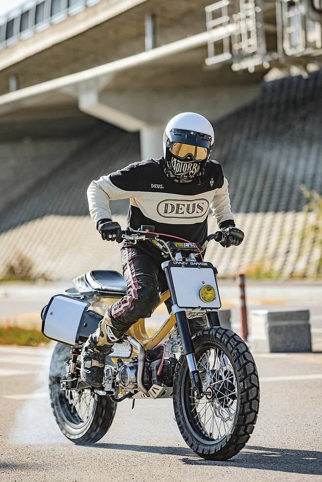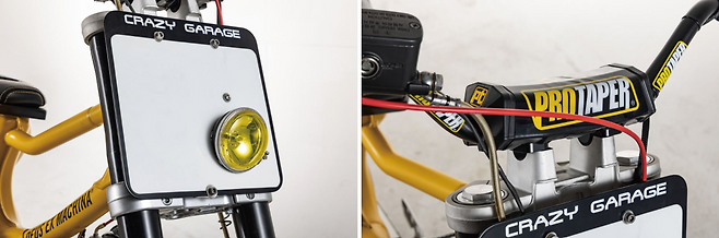 핸들은 오프로드 스타일의 프로 테이퍼 핸들 바를 장착해 상체가 서는 포지션을 완성했다. 전면에는 재킨 플레이트 디자인을 적용해 레이스머신 분위기를 내며 그 안에 노란색 할로겐램프를 장착했다. 납작하고 스포티한 1인승 커스텀 시트는 원오프로 작업 된 것으로 노란색 스티치로 차체와 컬러감을 맞추고 연료 주입을 위한 구멍을 마련했다. 기존의 배기 라인을 수정하여 업 머플러를 장착했으며 오프로드 주행을 고려하여 엔진 하부 가드를 장착했다. 엔진 좌측에 있는 작은 오픈타입의 에어필터가 나름의 고성능을 지향하는 것 같아 귀엽다. 크레이지 개러지에서 제작한 전용 스윙암을 장착해 휠베이스를 늘려 차체가 커진 효과를 준다.