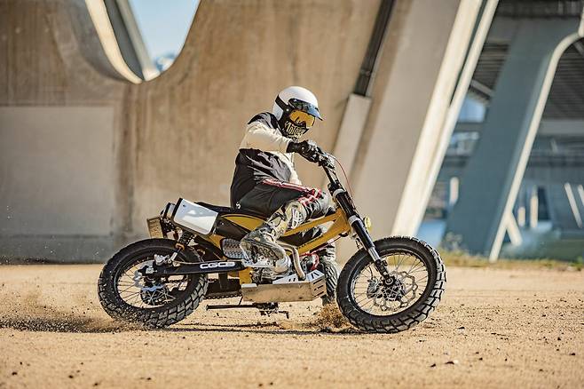 높게 올라온 오프로드 스타일의 핸들 바부터 블록 패턴의 타이어와 스포크 휠, 납작하게 눌린 시트와 재킨넘버 플레이트 등 영락없는 플랫트랙 레이스 머신이다
