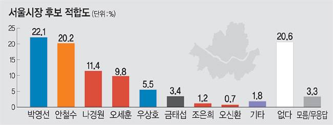 여야 후보 전체를 대상으로 한 후보 적합도 조사에서 박 전 장관은 22.1%, 안 대표가 20.2%를 기록했다. 이어 나경원 전 의원이 11.4%, 오세훈 전 서울시장이 9.8%로 각각 조사됐고, 우상호 민주당 의원(5.5%), 금태섭 전 의원(3.4%), 조은희 서울 서초구청장(1.2%), 오신환 전 의원(0.7%) 순이었다. ‘없다’는 응답은 20.6%, 모름·무응답은 3.3%였다.
