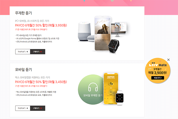 앞서 언급한 앱들이 이동통신사 사용자들을 위한 이용권을 마련해두었다면, 벅스는 간편결제나 신용카드 사용자들을 위한 이용권을 준비해두었다. 페이코 사용자들을 위한 '무제한 듣기'와 '모바일 듣기', KB국민카드 사용자들을 위한 'KB국민 나라사랑카드 할인', '리브메이트 할인' 등이 그것이다. 먼저 페이코 사용자들은 '무제한 듣기' 또는 '모바일 듣기' 이용권을 6개월 동안 50% 할인된 금액에 이용할 수 있다. 이용요금은 각각 월 3,950원, 월 3,450원으로 다른 음원 스트리밍 앱에 비해 저렴한 편이지만, 기존 이용권을 해지한 지 2개월이 지나야만 구입할 수 있다.