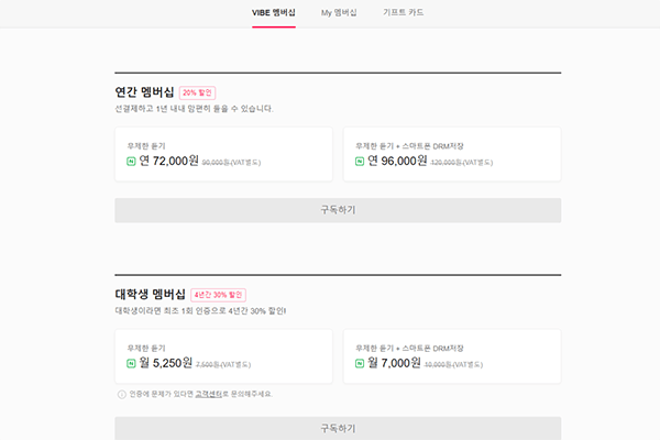 마지막으로 바이브는 주머니가 가벼운 대학생들을 위한 할인 혜택을 제공하고 있다. 대학생 인증을 하면 4년 동안 30% 할인된 금액에 서비스를 이용할 수 있는 것인데, 무제한 스트리밍은 월 5,250원에, 무제한 스트리밍과 스마트폰 DRM 저장은 월 7,000원에 이용 가능하다. 대학생들을 위한 할인 혜택이라 그런지 다른 스트리밍 서비스와 비교해도 이용권이 확실히 저렴한 편이다. 이 밖에도 첫 사용자를 위한 특별 혜택이 제공되는데, 가입 첫 달에는 0원에, 2~5개월에는 1,000원에 무제한 스트리밍을 이용할 수 있어 사용자가 빠르게 늘고 있는 것으로 전해진다.