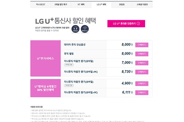 LGU+ 가입자를 위한 혜택으로는 'U+ 부가서비스', 'U+멤버십 6개월간 30% 할인 혜택'이 있다. 그중 가장 많이 사용되는 것이 'U+멤버십 6개월간 할인 혜택'의 '지니뮤직 마음껏 듣기(모바일)'이다. 이용요금은 모바일 전용 이용권이 월 7,700원, 모바일 및 PC 전용 이용권이 월 9,600원이지만, 할인 혜택을 받으면 각각 월 5,390원(2,100포인트 차감), 월 6,720원(2,620포인트 차감)에 이용할 수 있다. 단, 할인 기간 중 이용권을 해지할 경우 이미 차감된 멤버십 포인트는 환급되지 않으며, 6개월이 지나면 할인 혜택은 자동으로 종료된다.