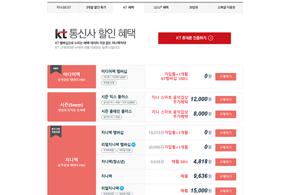 그중 인기가 가장 높은 것은 단연 '미디어팩'이다. 미디어팩에 가입한 KT 사용자들은 월 9,900원만 지불하면 지니뮤직 앱에서 무제한 스트리밍과 전용 데이터를 무제한으로 사용할 수 있고, 영상 전용 데이터 50GB, 유료 VOD 시청이 가능한 5,000원 상당의 TV 쿠폰, 통화 연결음, 캐치콜, 통화 가능 알리미 등의 서비스를 모두 이용할 수 있기 때문이다. 심지어 가입 후 첫 두 달은 이동통신사 멤버십 포인트로 미디어팩 이용요금을 지불할 수도 있다.
