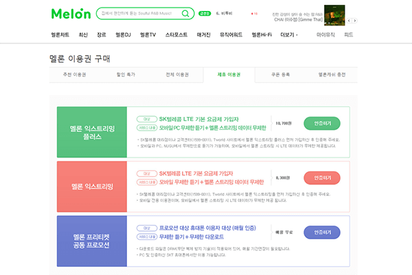 먼저 국내에서 이용자가 가장 많은 멜론의 이용권에 대해 알아보도록 하자. 멜론에는 SK텔레콤 LTE 기본 요금제 가입자들을 위한 제휴 이용권이 별도로 마련되어 있는데, 크게 '멜론 익스트리밍 플러스'와 '멜론 익스트리밍'으로 나뉜다. 전자는 모바일과 PC, 누구(NUGU)에서 무제한 스트리밍이 가능하고 모바일에서 멜론 앱으로 음악을 감상할 때 LTE 데이터가 무제한 제공되며, 후자는 모바일에서 무제한 스트리밍이 가능하고 LTE 데이터가 무제한 제공된다. 이용요금은 각각 월 10,700원, 월 8,300원이며, 이용권 구매를 위해 SK텔레콤 가입자임을 인증해야 한다. 멜론의 프리미엄 이용권인 '스트리밍 플러스(정기결제 시 월 10,900원)'이나 '모바일 스트리밍 클럽(정기결제 시 월 6,900원)'과 비교했을 때 이용금액이 저렴하지는 않지만, 음악 감상 시 LTE 데이터가 무제한 제공된다는 점이 눈에 띈다.
