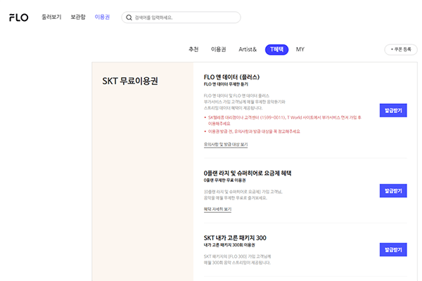 멜론과 마찬가지로 플로에도 SK텔레콤 사용자들을 위한 이용권이 준비되어 있다. 플로의 이용권을 보면 'T혜택'이라는 공간이 따로 마련되어 있을 정도인데, 이용권은 크게 'SKT 무료 이용권'과 'SKT 할인 이용권'으로 나뉜다. 전자는 SKT에서 제공하는 부가서비스에 가입되어 있는 사용자들을 대상으로 한 이용권이고, 후자는 T멤버십 또는 0캠퍼스 가입자들이 6개월 동안 무제한 스트리밍 서비스를 50% 할인된 금액에 이용할 수 있는 이용권이다. 이용금액만 보면 멜론보다 훨씬 저렴하다. 특별히 멜론을 써야 할 이유가 없는 SK텔레콤 가입자라면, 플로가 더 좋은 선택이 될 수 있겠다.