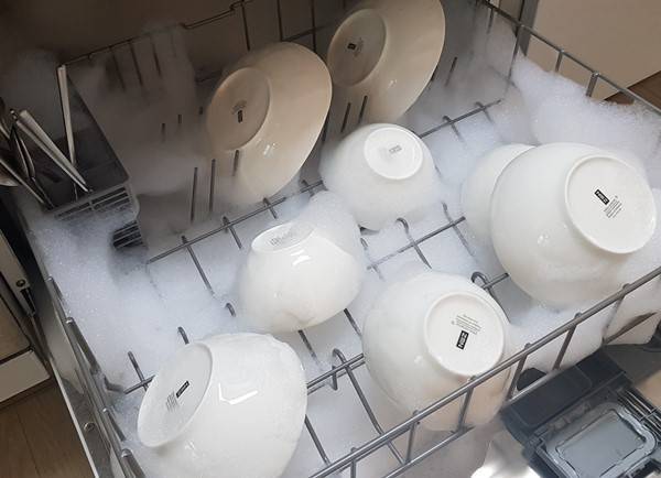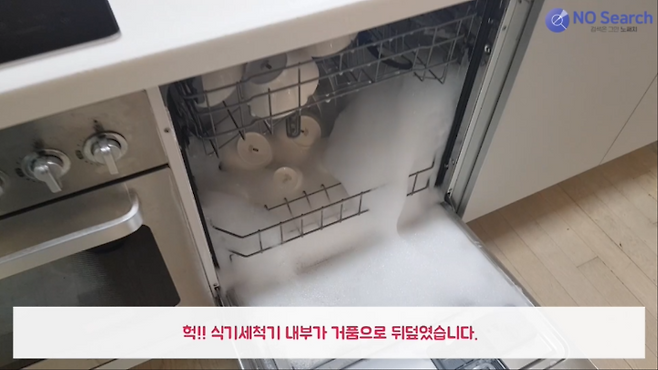 헉!! 식기세척기 내부가 거품으로 뒤덮였습니다.