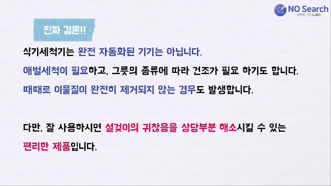 식기세척기는 완전 자동화된 기기가 아니고, 개인에 따라 체감효과도 다를 수 있으니 잘 고민해보시고 구매하세요.