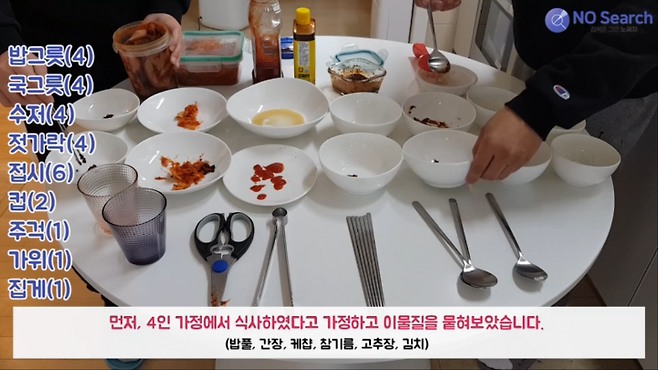 4인 가정에서 식사하였다고 가정하여 그릇을 준비하고, 6가지 이물질을 뭍힌 후 30분간 그대로 두었습니다.