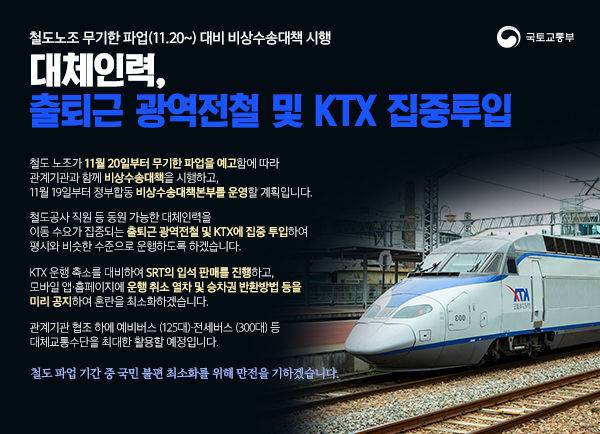 ㅇ 국민 불편을 최소화하기 위해 국방부 등 관계기관과 함께 파업 돌입 시 비상수송대책을 시행하고, 11월 19일부터 정부합동 비상수송대책본부를 운영할 계획임을 밝혔습니다.