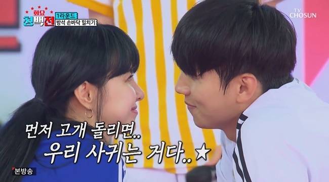 이날 '화요청백전' 공식 커플 청팀 은가은, 백팀 이대형이 방석 위에서 손바닥 밀치기 게임을 진행했다. 이에 MC 이찬원은 "궁합도 안 보는 4살 차이"라고 두 사람을 응원했다.