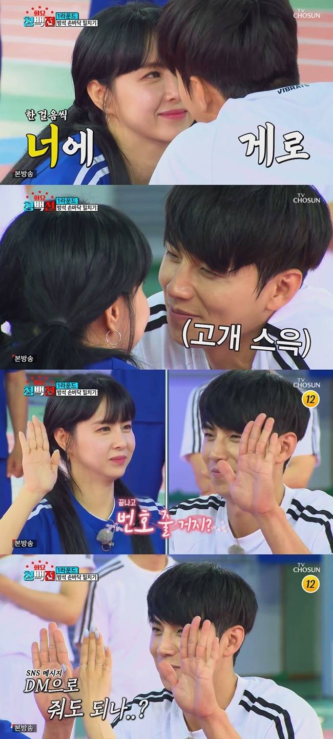 이날 '화요청백전' 공식 커플 청팀 은가은, 백팀 이대형이 방석 위에서 손바닥 밀치기 게임을 진행했다.