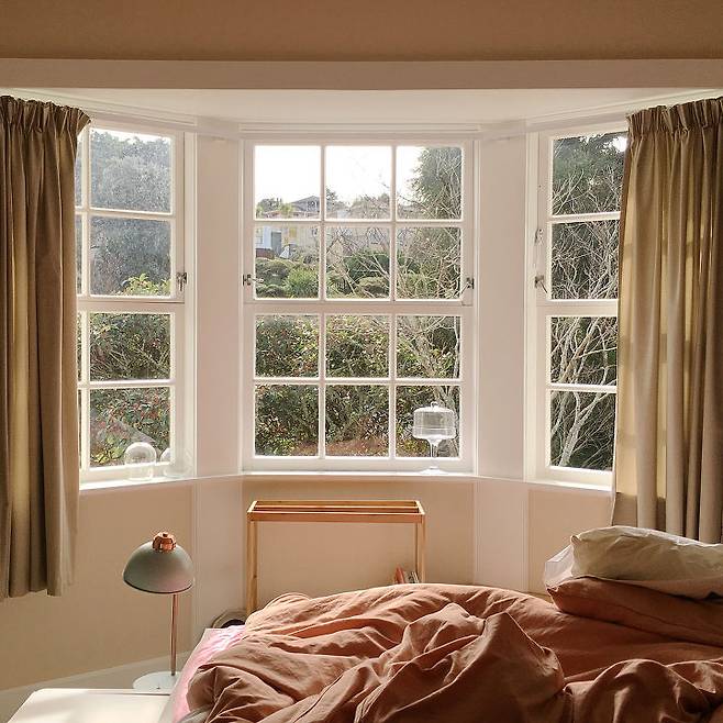 무심코 바라본 창문에서 보인 하늘빛과 그레이톤의 침실 컬러, 조명이 어우러진 모습이 액자 같은 느낌으로 다가왔던 날입니다. :)