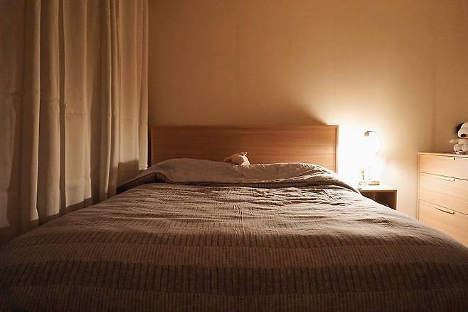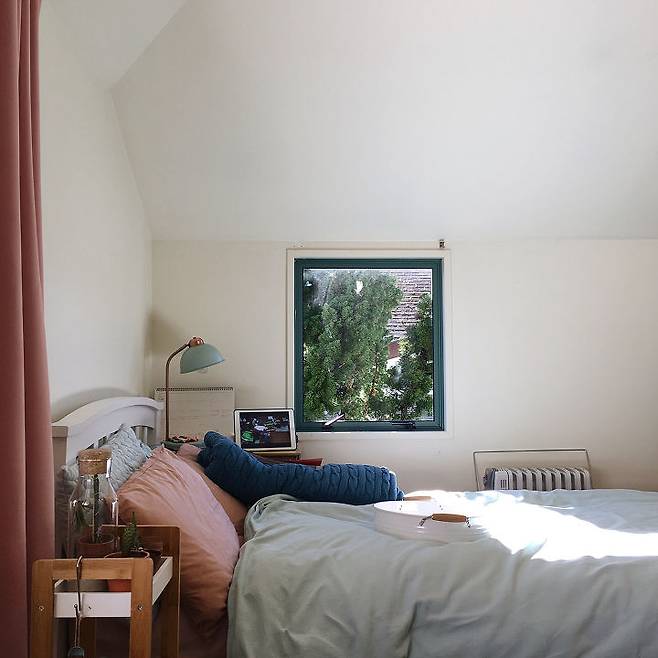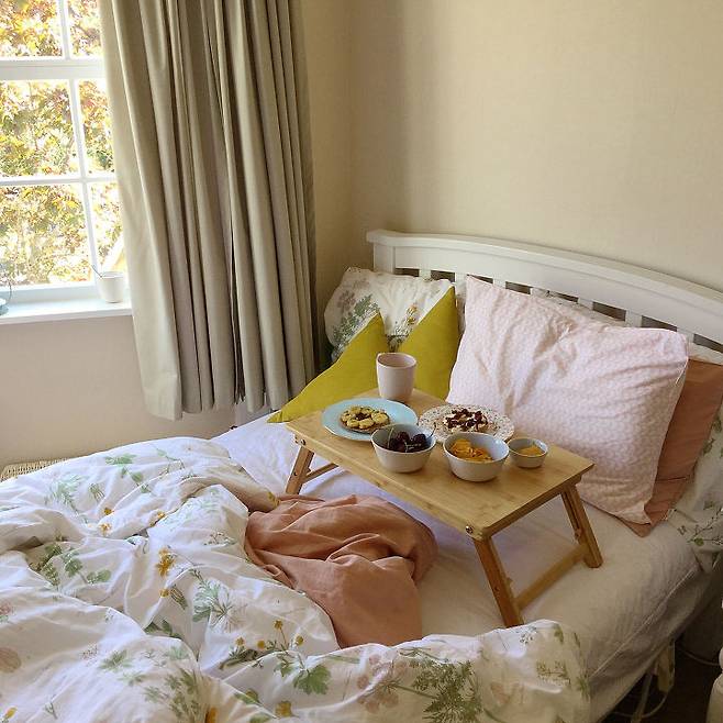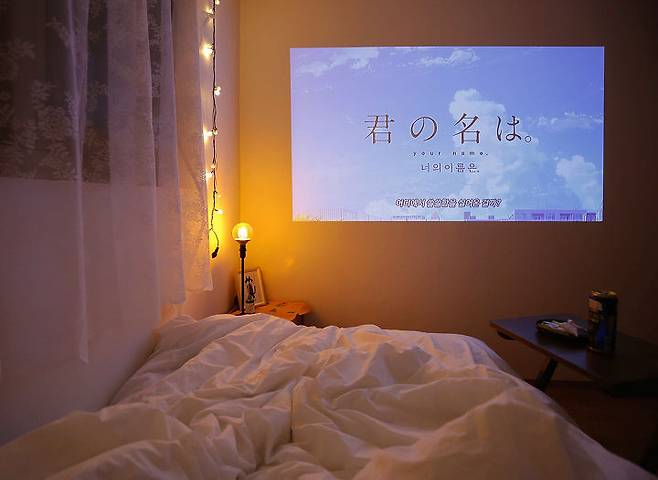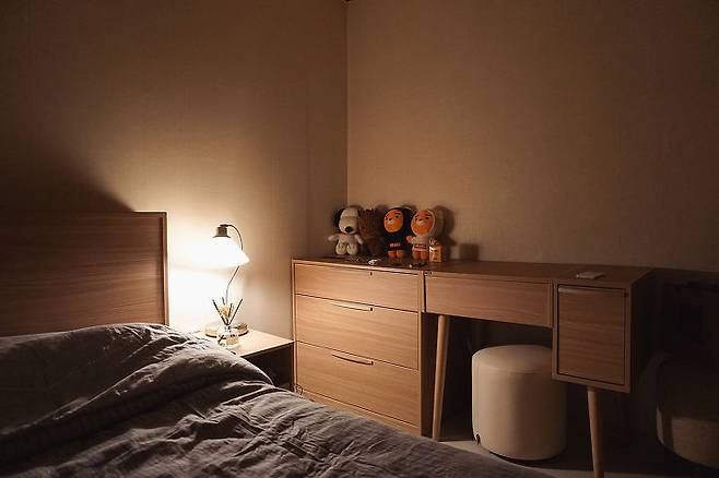 아기자기하고 코지한 느낌을 좋아해서 취향을 담아 최대한 포근하고 아늑한 공간으로 만들었어요. 저녁에는 침대에 누워서 영화 보며 맥주 한 캔씩 마시곤 해요.