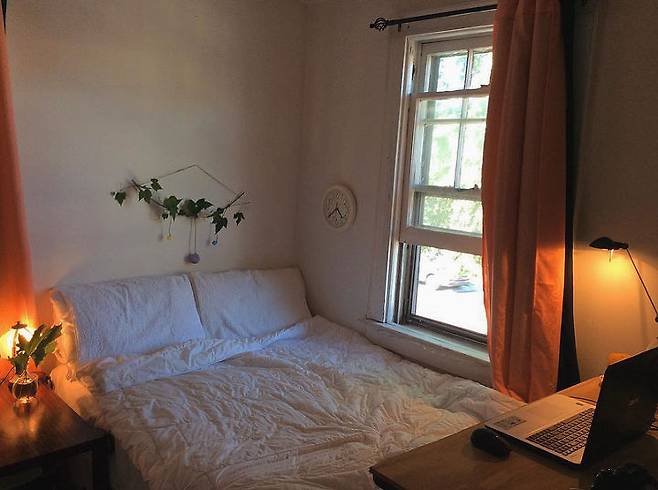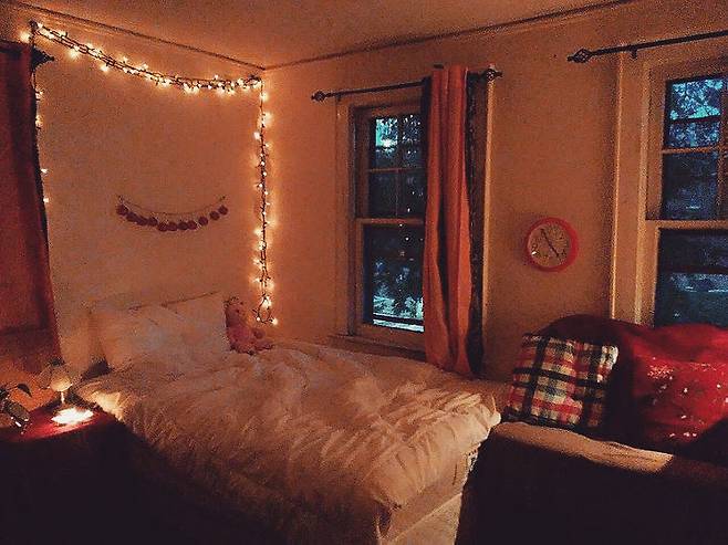 침대매트 : IKEA / 침구 : IKEA, renoma / 커튼, 테이블, 가랜드, 알조명, 벽시계 : target