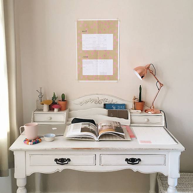 침구: IKEA / 버섯펠트 : Iko Iko / 수건걸이 : Kmart / 좌식테이블 : coupang / 달력 : Frankie magazine / 작업등 : Freedom Furniture / 시계 : Wairau the design store / 침대, 책상, 칠판 : Early settler furniture