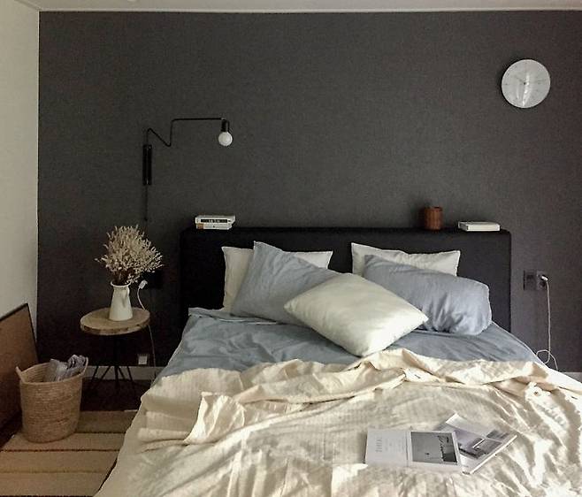 러그 : H&M home / 시계 : 이마트 eonclock / 침구 : 메종드룸룸 - 도쿄화이트 / 탁상조명 : 이케아 JANUARI 탁상스탠드 / 조명 올려진 테이블 : 이케아 NESNA 협탁 / 침대 옆 테이블 : 이케아 TARNO 야외 테이블 / 노트북 테이블 : 자이너스 대나무 원목 거실 쇼파테이블 st002